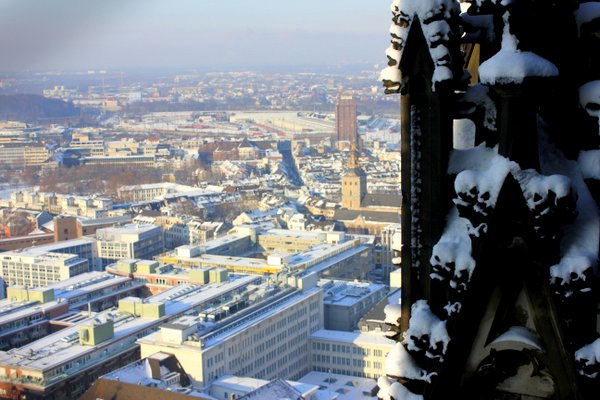 When we finally made it the top, we were able to catch our breath long enough to enjoy the festive vistas of the snow-covered city; from the icy Rhine River to the cheery red-tented Christmas markets.