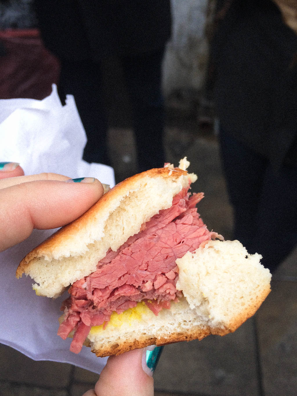 There was quite a line outside Beigel Bake, and from my first bite of this salt beef sandwich I could see why. The fatty, melt-in-your mouth meat paired with the yeasty bagel and dab of sharp yellow mustard made for a perfect fatty-acidic taste combination.